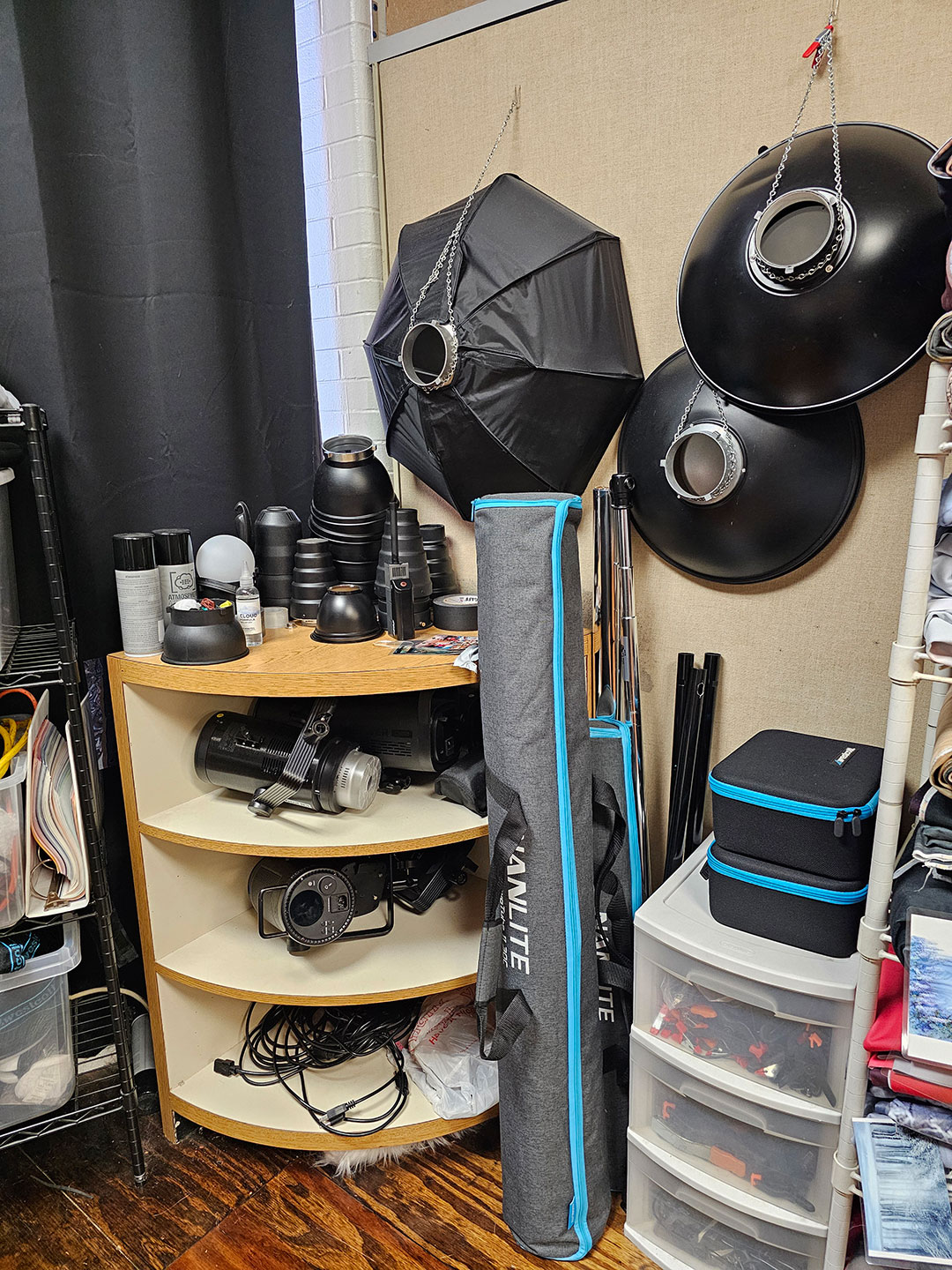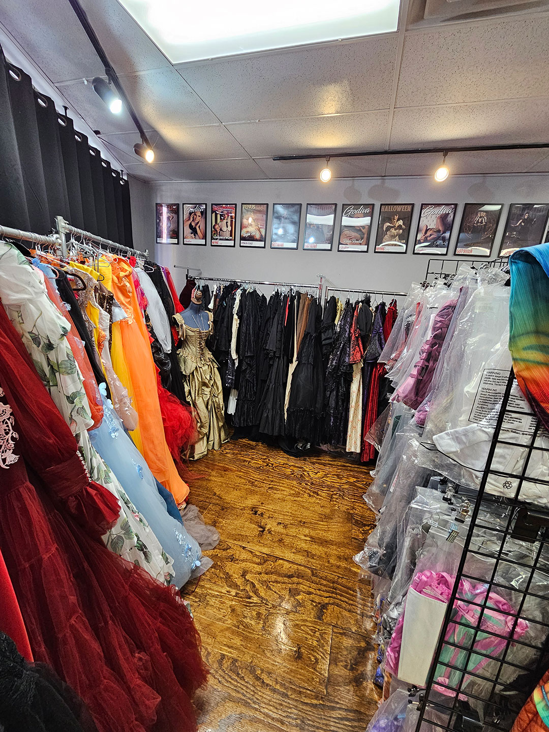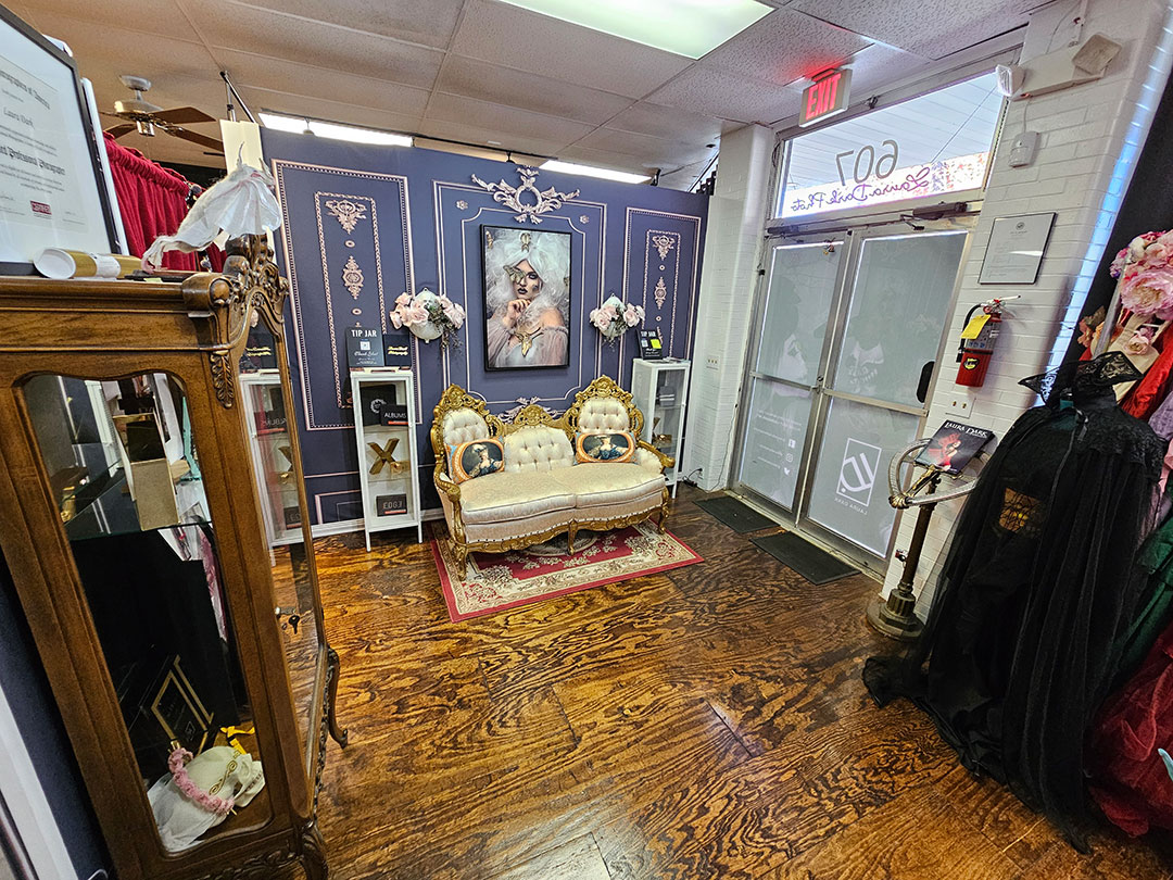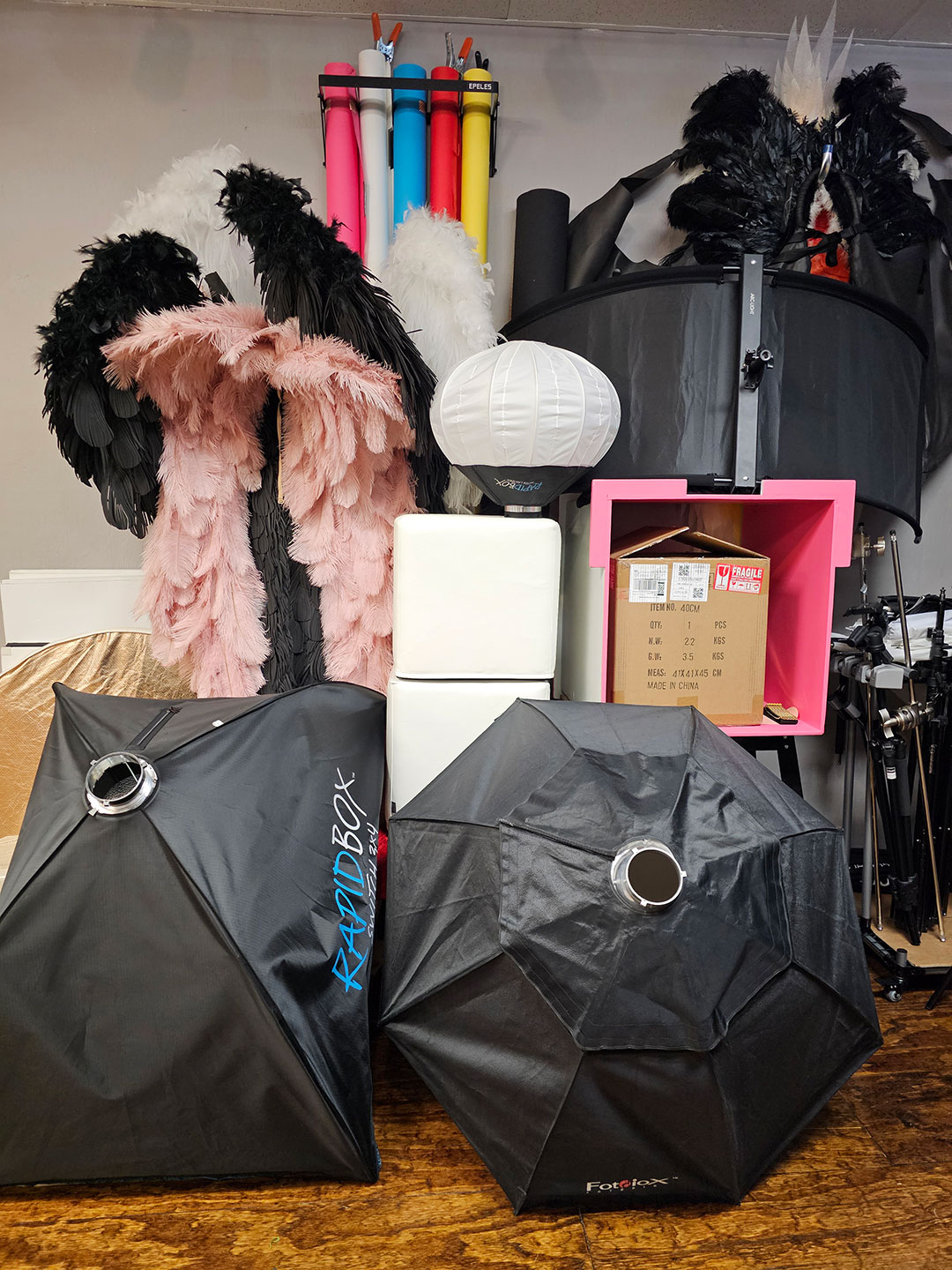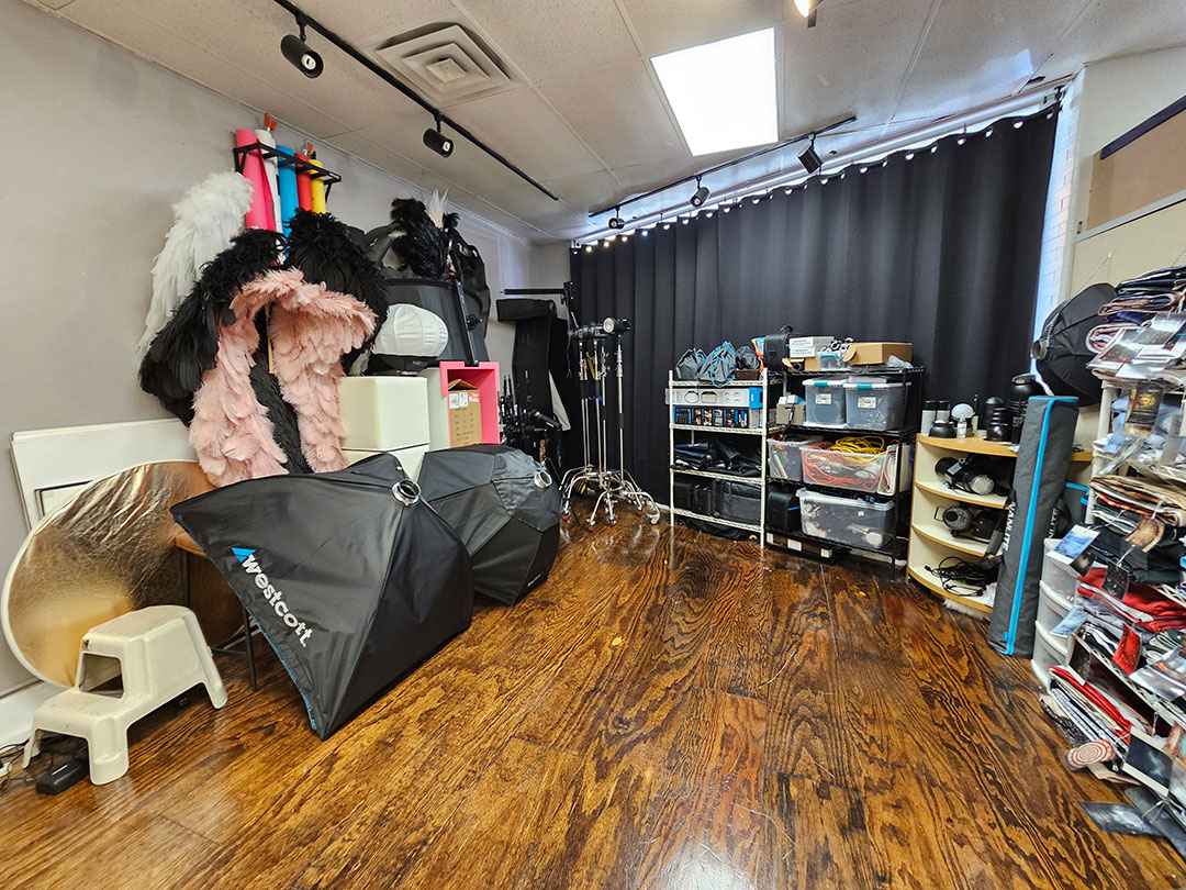 The studio offers six distinctive sets—including the Blue Parlor, Red Parlor, Flower Wall, Boudoir set, BDSM set, and Headshot Wall—along with access to 80 scenic backgrounds, colorful seamless papers, and a black curtain wall. For an additional fee, photographers can upgrade with a professional lighting kit featuring five 300W strobes, modifiers, gels, and atmospheric effects, as well as exclusive extras such as fairy, angel, or bat wings and an extensive wardrobe collection of gowns, corsets, wigs, accessories, and props.